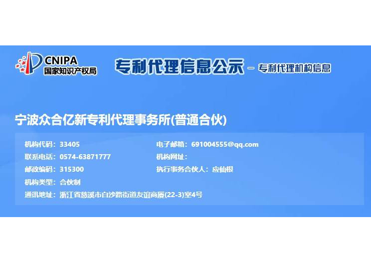 浙江億新知識(shí)產(chǎn)權(quán)服務(wù)有限公司前身為慈溪眾合知識(shí)產(chǎn)權(quán)代理事務(wù)所,創(chuàng)始于2004年,為了服務(wù)更多的創(chuàng)新企業(yè),實(shí)現(xiàn)“服務(wù)億萬(wàn)創(chuàng)新企業(yè)”的理念,后更名為浙江億新知識(shí)產(chǎn)權(quán),旗下公司包括:寧波眾合億新專利代理事務(wù)所(機(jī)構(gòu)代碼33405)、中范(北京)認(rèn)證有限公司。其中寧波眾合億新專利代理事務(wù)所是慈溪市科技服務(wù)聯(lián)盟理事單位,前灣區(qū)知識(shí)產(chǎn)權(quán)工作站。公司位于浙江省慈溪市文化商務(wù)區(qū)友誼商廈,并在北京、青島設(shè)有辦事處。